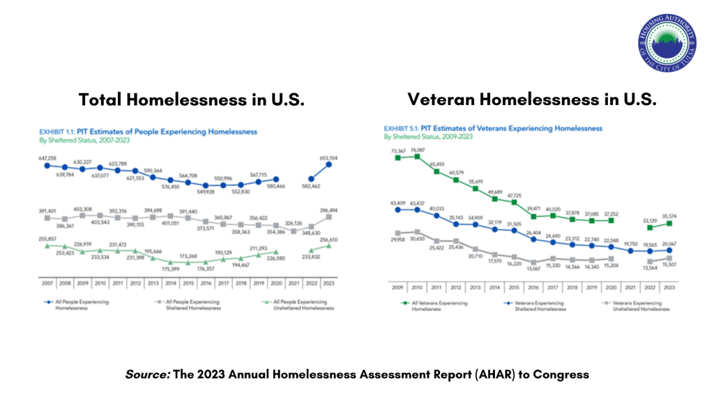 How well does this model work? The rate of veteran homelessness in the U.S. dropped more than 55% from 2010 – 2022, compared to an 8.6% decline in homelessness among the general population (source). To date, three states and 84 communities across the U.S. have reached effectively ended veteran homelessness (source).